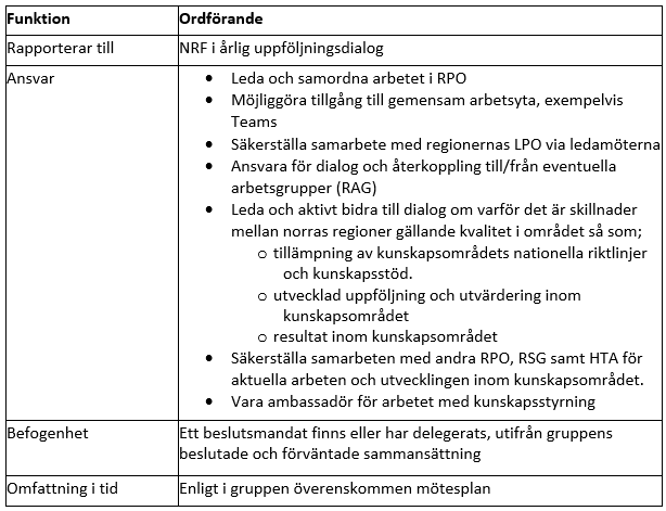 Sammanställning av roller och ansvar för ordförande och övriga ledamöter i RPO.